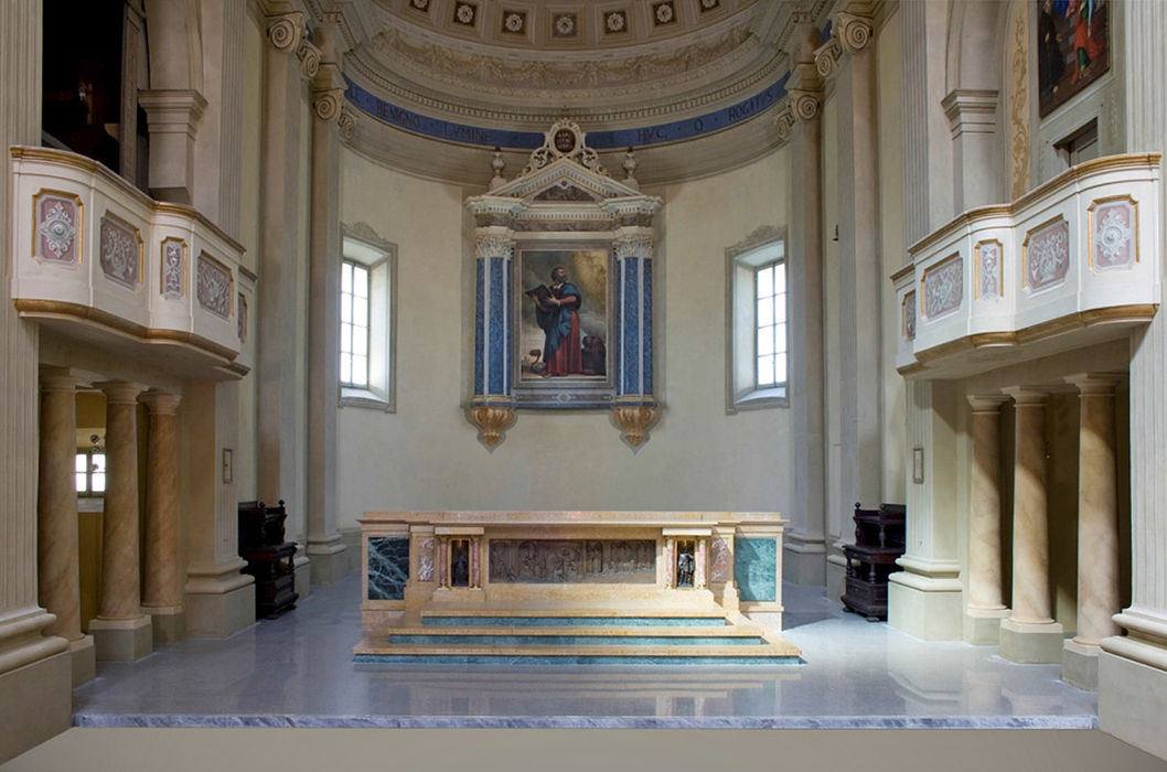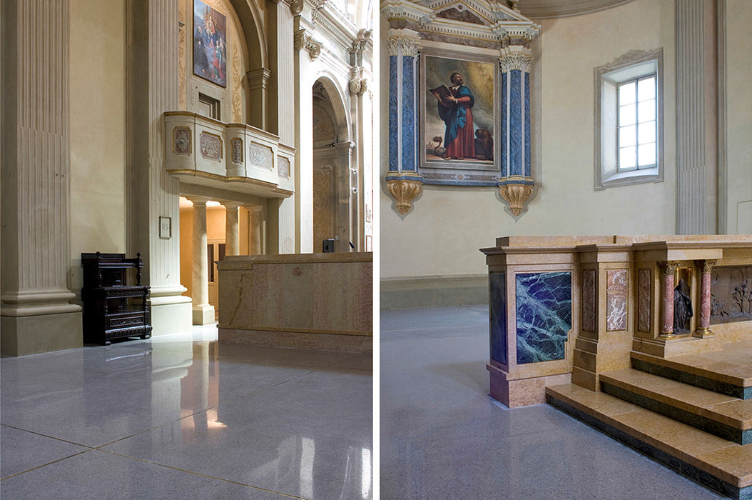 Realizzazione di Terrazzo alla Veneziana con legante in resina presso la BASILICA MINORE di SAN MARCO, a Boretto (Reggio Emilia).